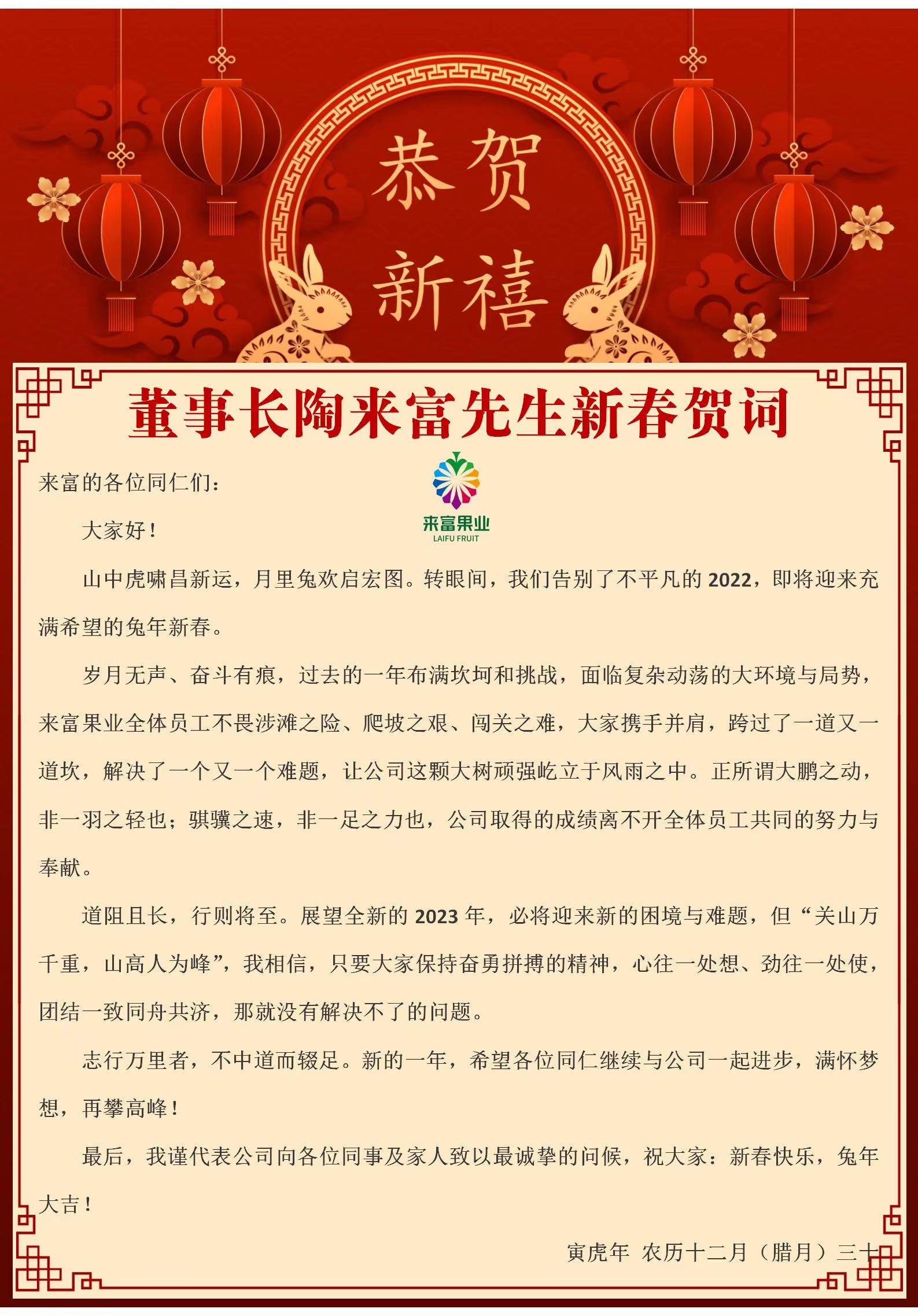 董事长陶来富先生兔年新春贺词