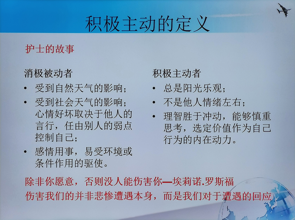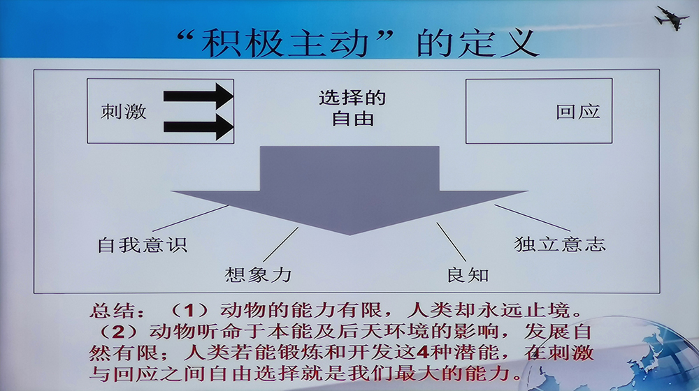 随后,唐老师通过维也纳第三心理治疗学派 - 意义治疗与存在主义分析学派创始人——维克多·弗兰克尔先生的故事,引出积极主动的定义。他表示,在我们无法改变外在条件的情况下,选择和心态就成了改变自身处境决定性的因素。而选择往往取决于心态,因而保持乐观积极的心态是十分重要的。